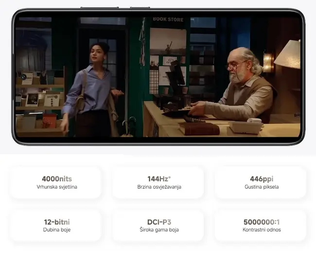 Ekran od 6,67 inča na Xiaomi 14T je njegova najbolja karakteristika i glavna prodajna tačka. U pitanju je prekrasan AMOLED panel koji je svijetao, oštar i kontrastan u raznim uslovima. Videozapisi, fotografije, igre i sve ostalo što možete prikazati na ovom ekranu izgleda fantastično. Odnos širine i visine slike 20:9 a rezolucija 2.712 x 1.220. Ekran ima prilagodljivu brzinu osvježavanja do 144Hz, fluidan je i detaljan. Dostiže vršnu vrijednost svjetline od 4.000 nita. To znači da sigurno nećete imati problema s korištenjem na otvorenom.