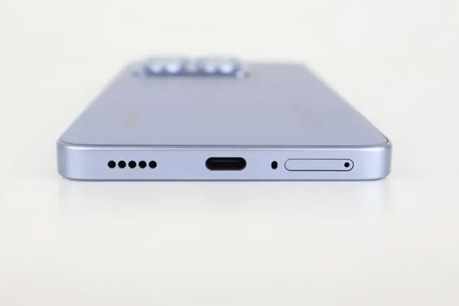 Dugme za jačinu zvuka i teksturirano dugme za napajanje nalaze se na desnoj strani. Na dnu se nalazi USB-C port i dual-SIM ležište. Zvučnik na donjoj ivici i izrez u slušalici na gornjem okviru čine stereo par.